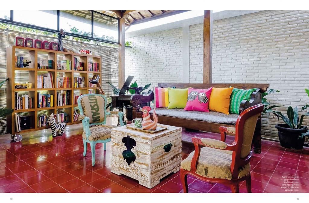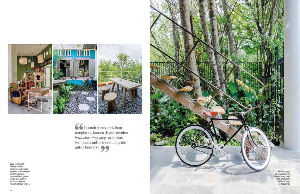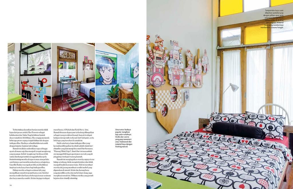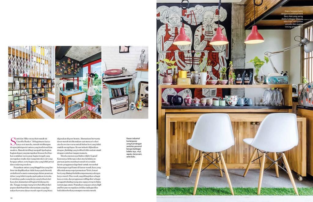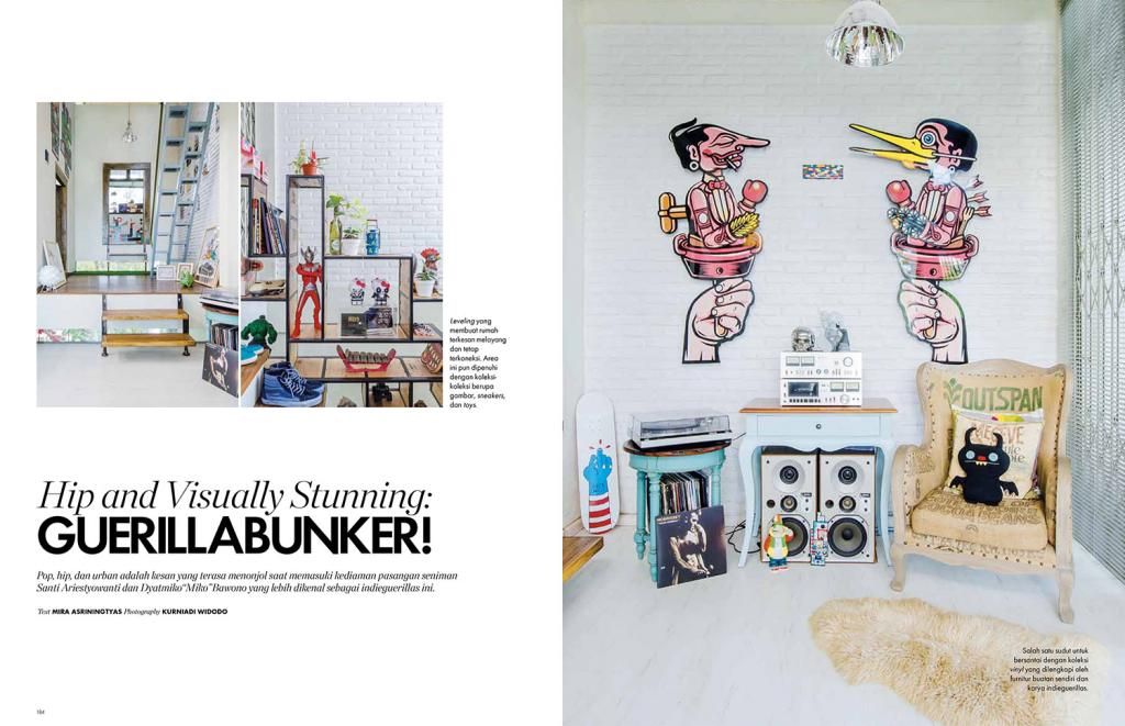 Now this is one cool house that's really easy on the eye. The home of Santi Ariestyowanti & Dyatmiko Bawono, more widely known as the artist duo indieguerillas, is so full of details on every corner that it feels like you could point a camera anywhere and would still get an interesting picture out of it. (It certainly helps during the shoot!) The style is decidedly eclectic; East meets West, the traditional past comfortably mingling with the urban and the contemporary. From antique cabinets housing hip toys, stair steps made out of skateboards, Hello Kitty dressed as KISS personels, to Raden Saleh's famous painting Capture of Prince Diponegoro reimagined in the style of Hergé, the mix and clash are endless. And yet it all works.
